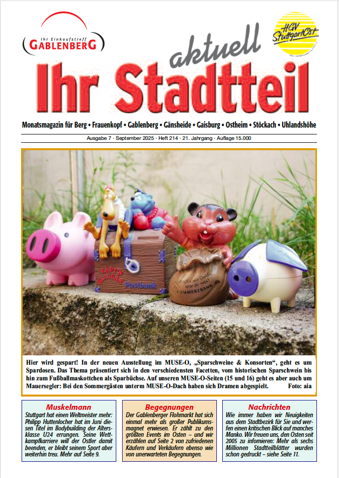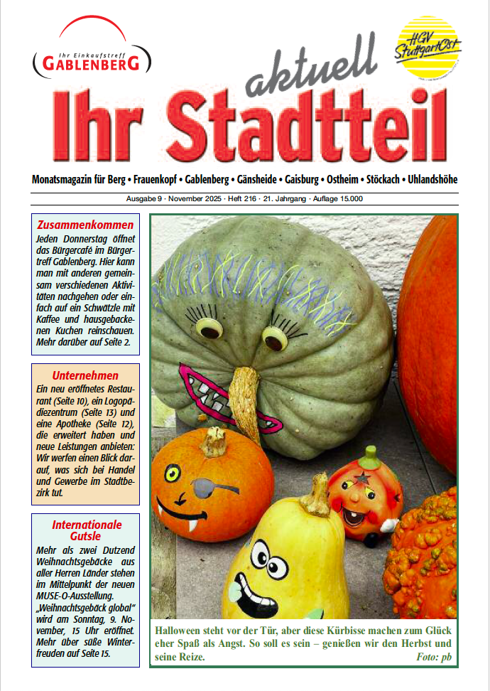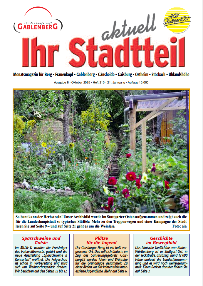 Jeden Monat erscheint unser "Ihr Stadtteil aktuell" aufs Neue. Mit News, Geschichten und Informationen für die Region, erscheint für die Stadtteile Berg, Frauenkopf, Gablenberg, Gaisburg, Ostheim, Stöckach und Uhlandshöhe.